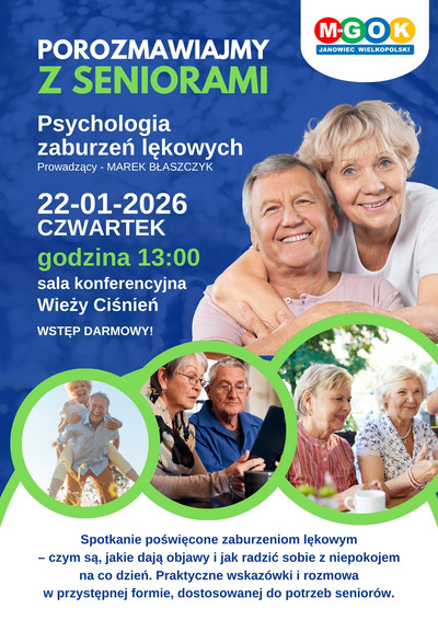 Spotkanie poświęcone zaburzeniom lękowym – czym są, jakie dają objawy i jak radzić sobie z niepokojem na co dzień. Praktyczne wskazówki i rozmowa w przystępnej formie, dostosowanej do potrzeb seniorów.